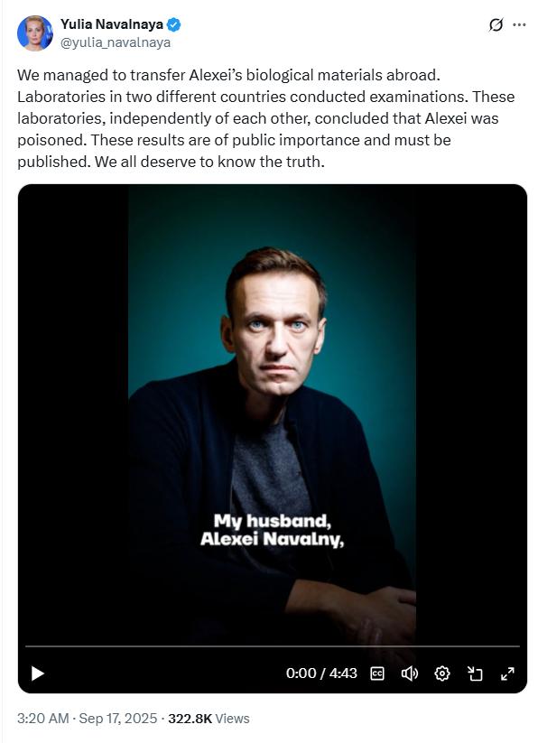 On September 17, 2025, Yulia Navalnaya delivered a striking message: two independent laboratories abroad examined Alexei Navalny’s biological samples and concluded that he had been poisoned. The statement came a year and a half after his death in a remote Arctic penal colony, transforming a personal tragedy into a political and moral demand for accountability.