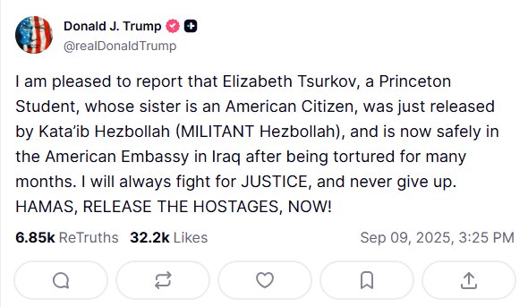В сентябре 2025 года, проведя 903 дня в плену в Багдаде, была освобождена исследовательница ближневосточной политики Элизабет Цурков. Она обладает российским и израильским гражданством, её похищение в марте 2023 года шиитской группировкой Kata’ib Hezbollah стало международным кризисом, объединившим интересы США, Израиля, России и Ирака. Освобождение Цурков стало примером того, как права человека, академическая свобода и геополитика тесно переплетены в современных конфликтах.